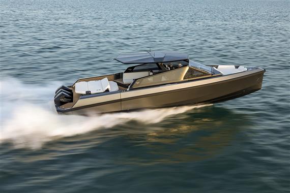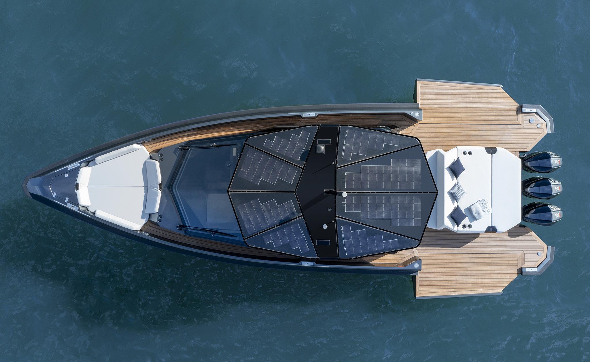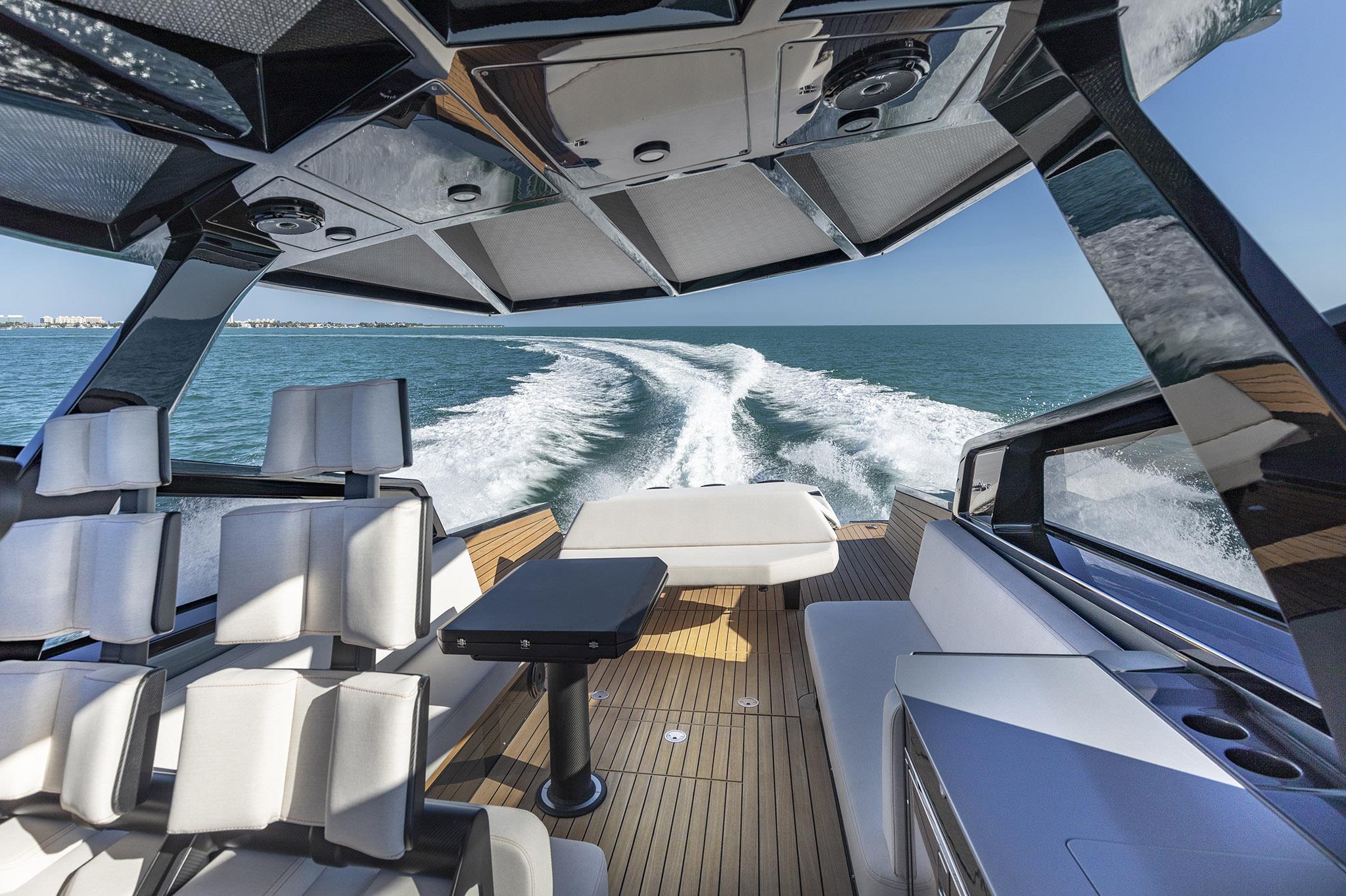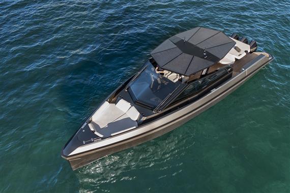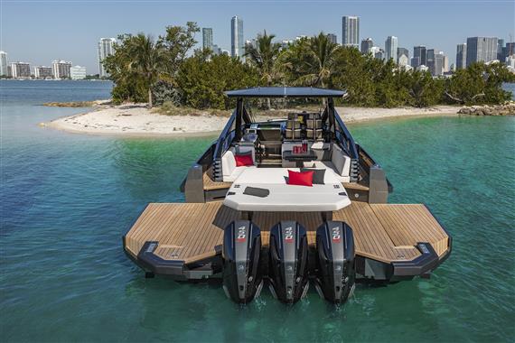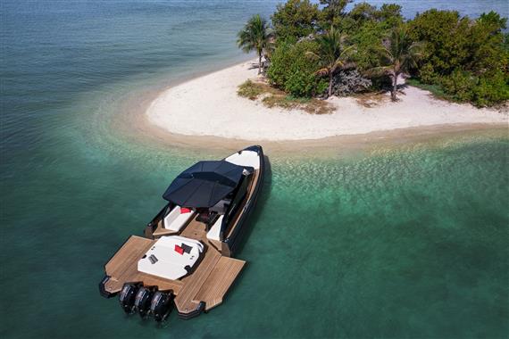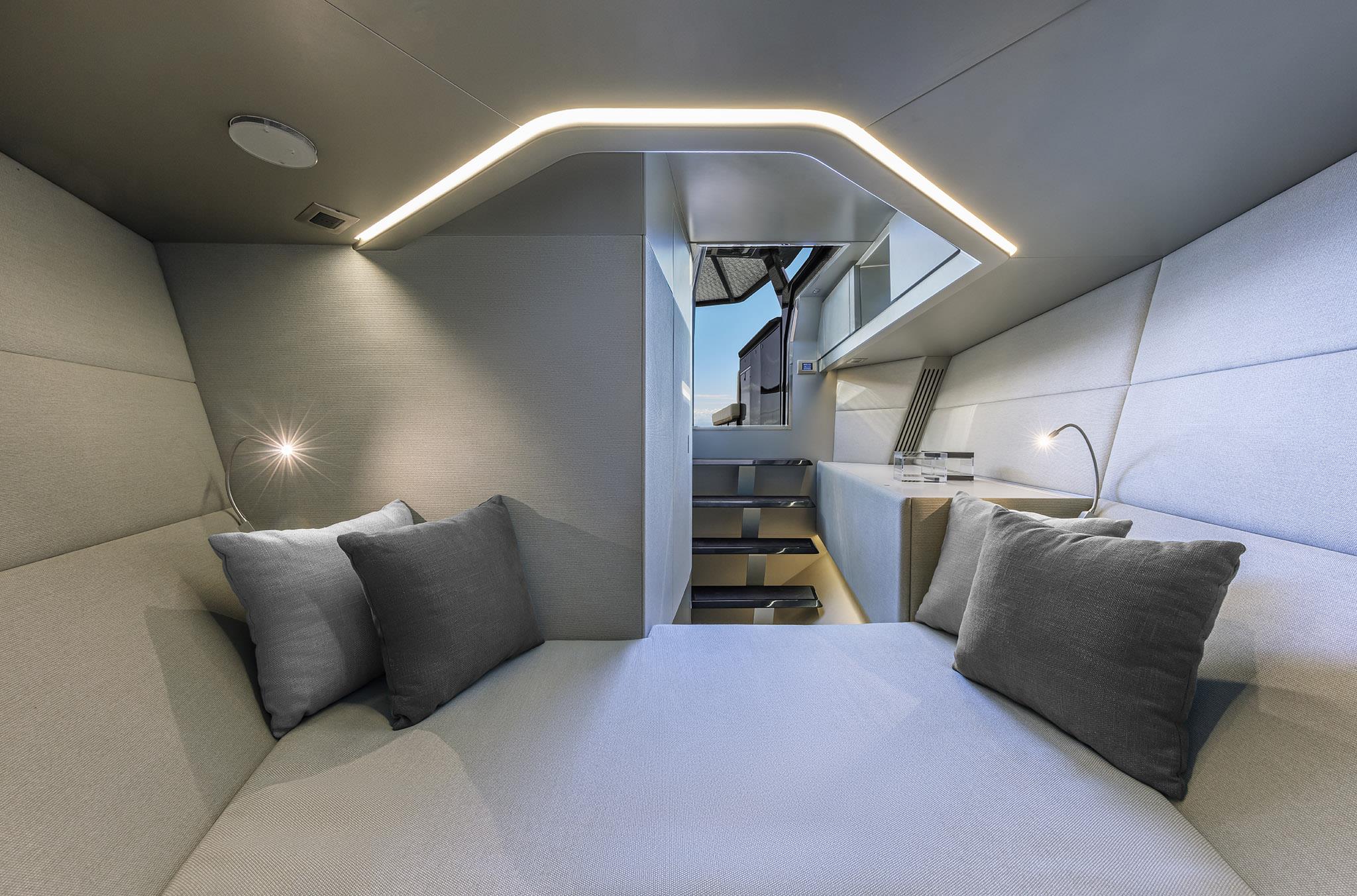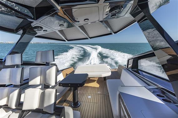Fold-down aft wings enlarge the entertaining space, which can be configured with a characteristically smart array of articulated sunpads and sofa. And uniquely for an outboard model, we have found a way to retain the hydraulic passerelle that doubles as a swim ladder at the stern.