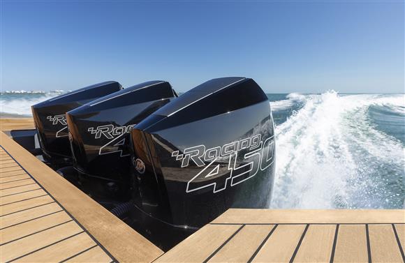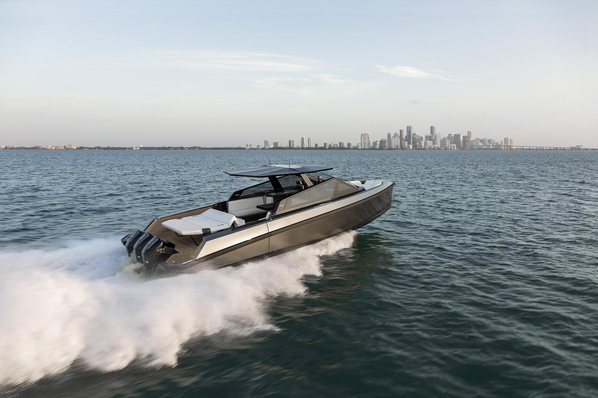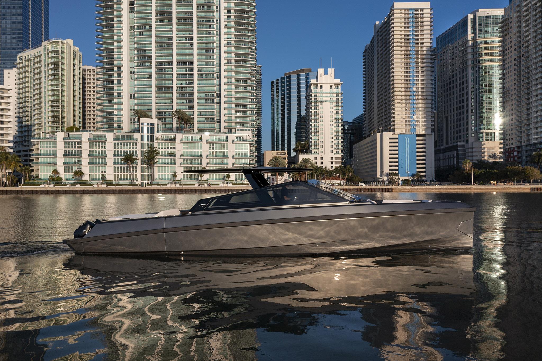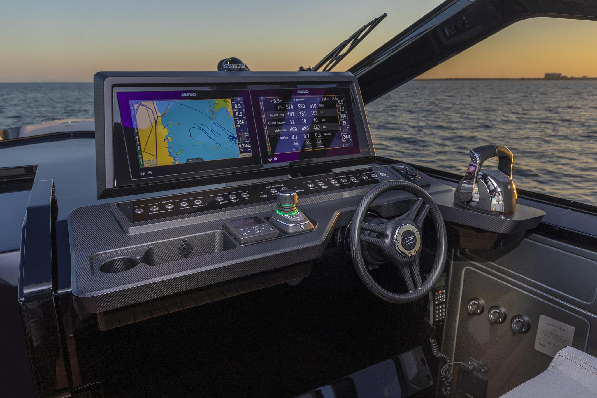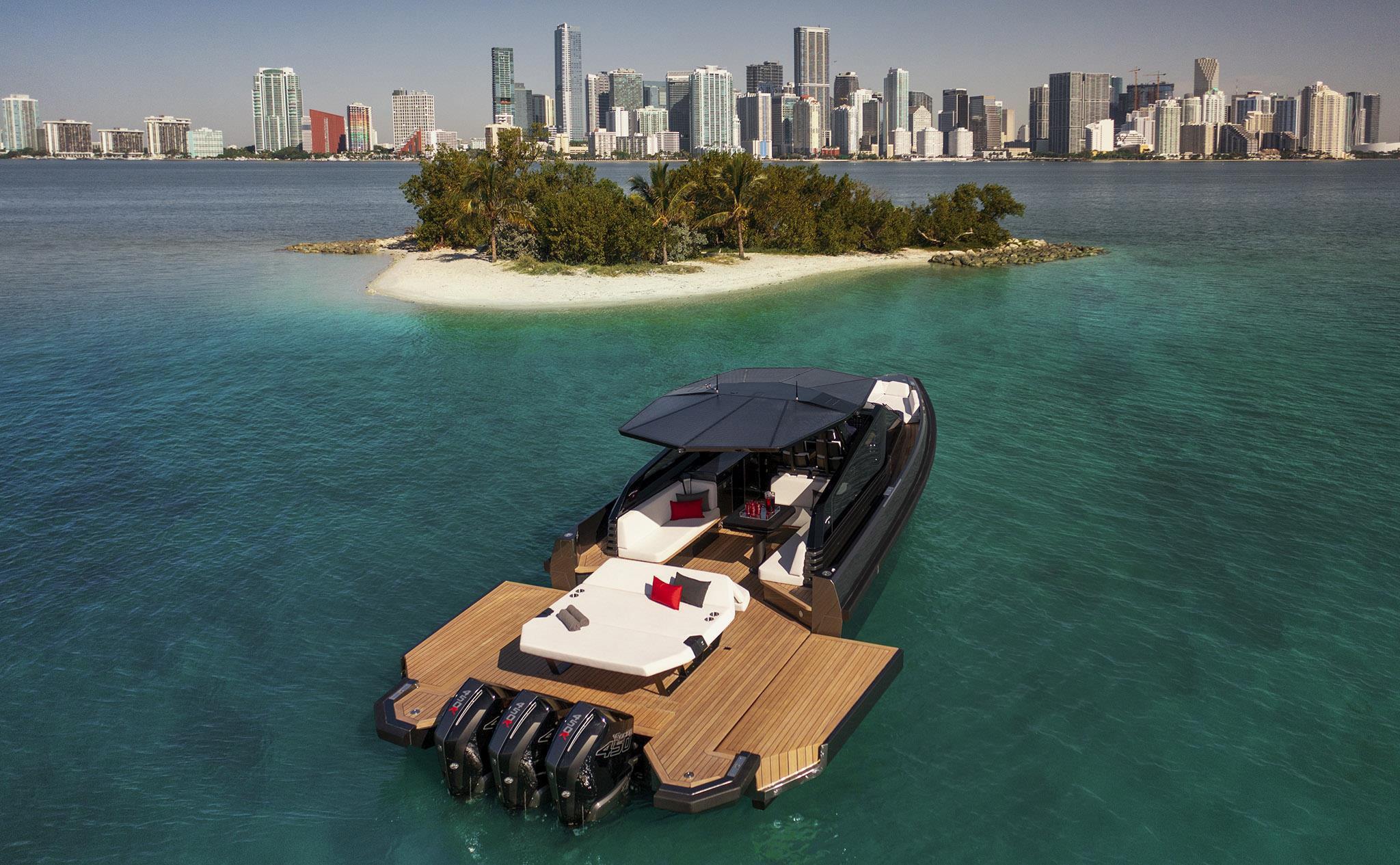 Packing the same angular aesthetic and slippery hull as the wallytender43, this outboard version can exceed 50 knots with the option of three Mercury Verado 450R racing engines. And yet, control is pitch-perfect; the hull delivering exceptional seaworthiness. Joystick controls, dynamic positioning and autopilot come as standard.