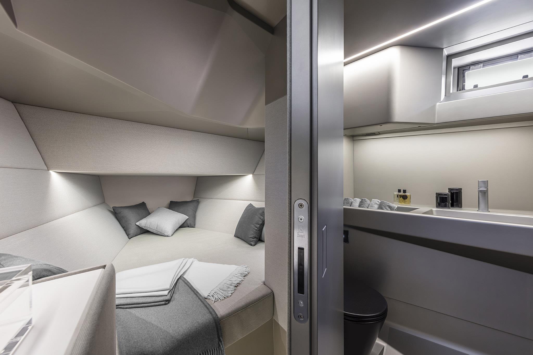 Though conceived for outdoor living, the wallytender43X has an extremely comfortable double berth below. The space is naturally air-conditioned and complemented by a generous bathroom with separate walk-in shower.